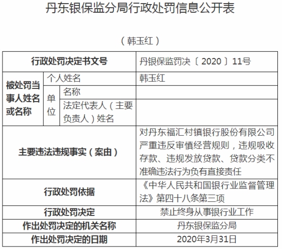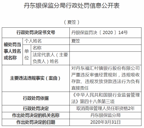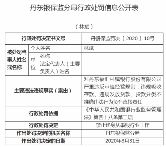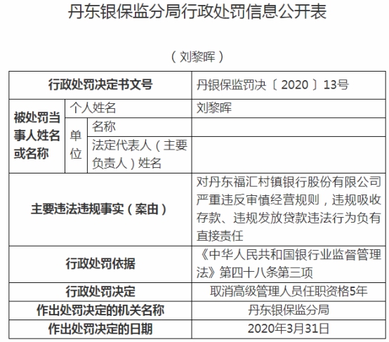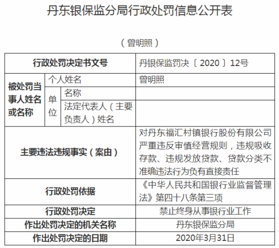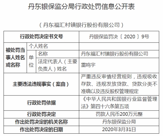 丹东福汇村镇银行违规被罚