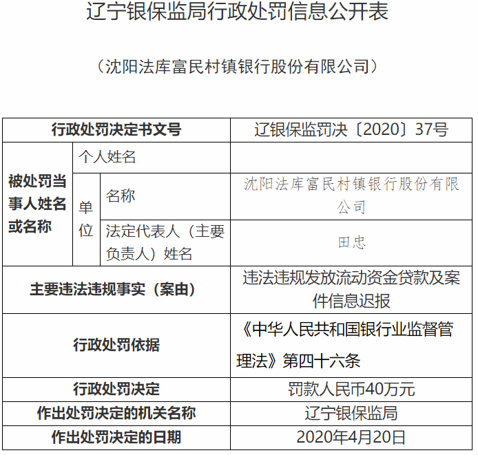 •   中国经济网北京4月23日讯 银保监会网站昨日公布的辽宁银保监局行政处罚信息公开表(辽银保监罚决〔2020〕37号、40号、41号、42号)显示,沈阳法库富民村镇银行股份有限公司存在违法违规发放流动资金贷款及案件信息迟报两宗违法违规行为。根据《中华人民共和国银行业监督管理法》第四十六条,辽宁银保监局对其处以罚款人民币40万元。