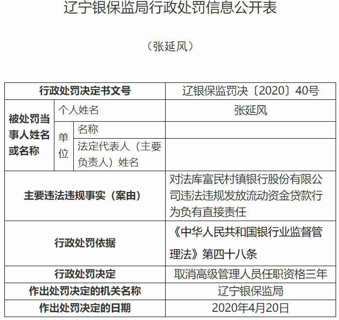 张延风对法库富民村镇银行股份有限公司违法违规发放流动资金贷款行为负有直接责任。根据《中华人民共和国银行业监督管理法》第四十八条,辽宁银保监局对其作出取消高级管理人员任职资格三年的行政处罚决定。