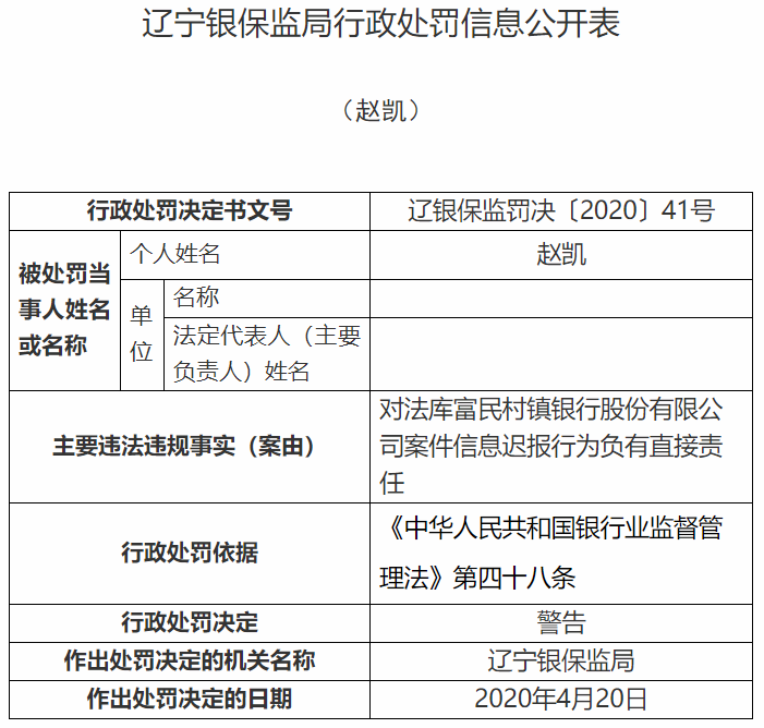 赵凯对法库富民村镇银行股份有限公司案件信息迟报行为负有直接责任。根据《中华人民共和国银行业监督管理法》第四十八条,辽宁银保监局对其警告。