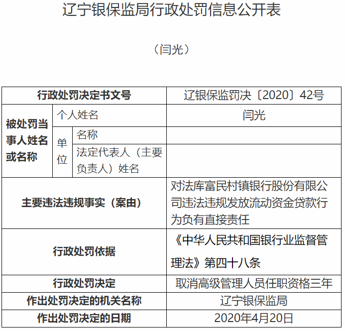 闫光对法库富民村镇银行股份有限公司违法违规发放流动资金贷款行为负有直接责任。根据《中华人民共和国银行业监督管理法》第四十八条,辽宁银保监局对其作出取消高级管理人员任职资格三年的行政处罚决定。