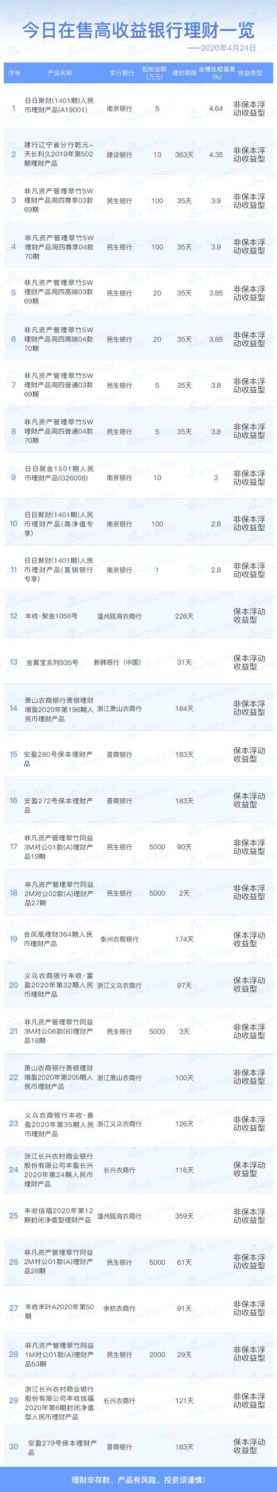 •   新浪财经消息:2020年4月24日在售高收益银行理财产品:今日业绩比较基准在4.6%以上的银行人民币理财产品有一款,是南京银行的“日日聚财(1401期)人民币理财产品(A19001)”业绩比较基准为4.64%。