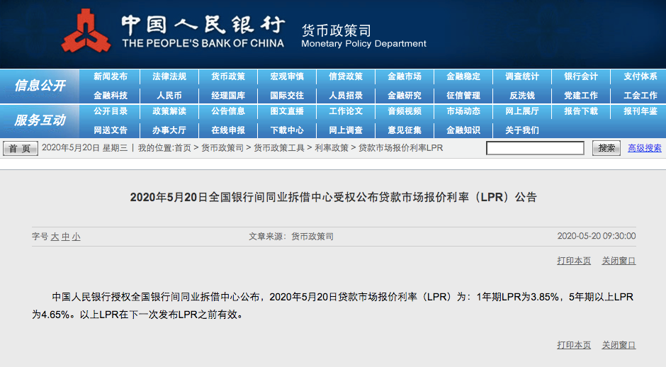 •         中国金融网讯    央行官网发布消息称,中国人民银行授权全国银行间同业拆借中心公布,2020年5月20日贷款市场报价利率(LPR)为:1年期LPR为3.85%,5年期以上LPR为4.65%。以上LPR在下一次发布LPR之前有效。