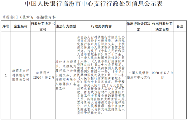 •   中国经济网北京5月28日讯 中国人民银行太原中心支行今日公布的中国人民银行临汾市中心支行行政处罚信息公示表(临银罚字〔2020〕第2号)显示,汾西县太行村镇银行有限责任公司存在对外支出残损币、未按规定履行客户身份识别义务、未按规定开展个人结算账户备案工作三宗违法违规行为。
