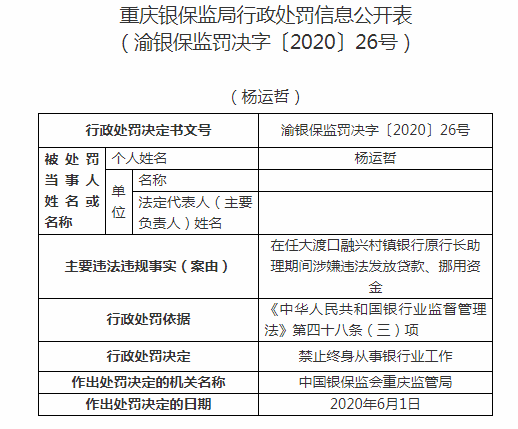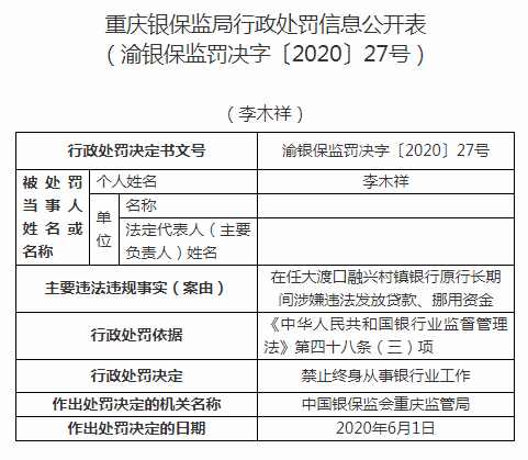 重庆大渡口融兴村镇银行原行长被禁业:违法发放贷款