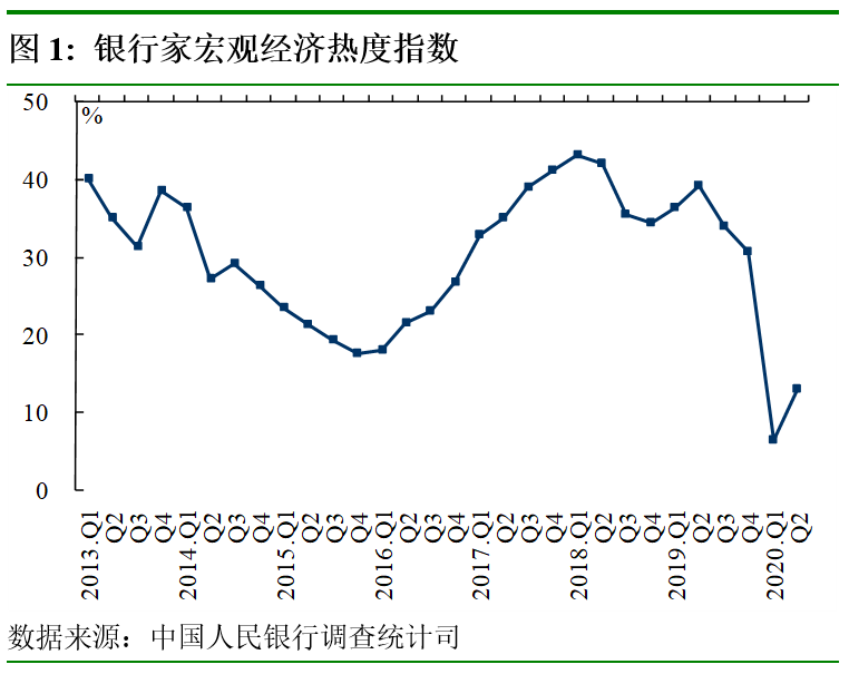 1.宏观经济热度指数:反映当前宏观经济状况的扩散指数。该指数的计算方法是在全部接受调查的银行家中,先分别计算认为本季经济“偏热”和“正常”的占比,再分别赋予权重1和0.5后求和得出。