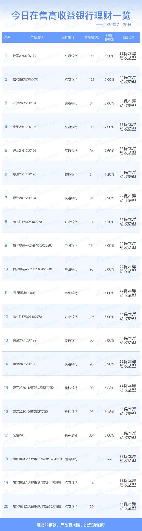 •   新浪财经消息    7月20日在售高收益银行理财产品:今日业绩比较基准在8.0%及以上的银行人民币理财产品共3款。交通银行的“沪深2463200132”业绩比较基准最高,为9.20%。