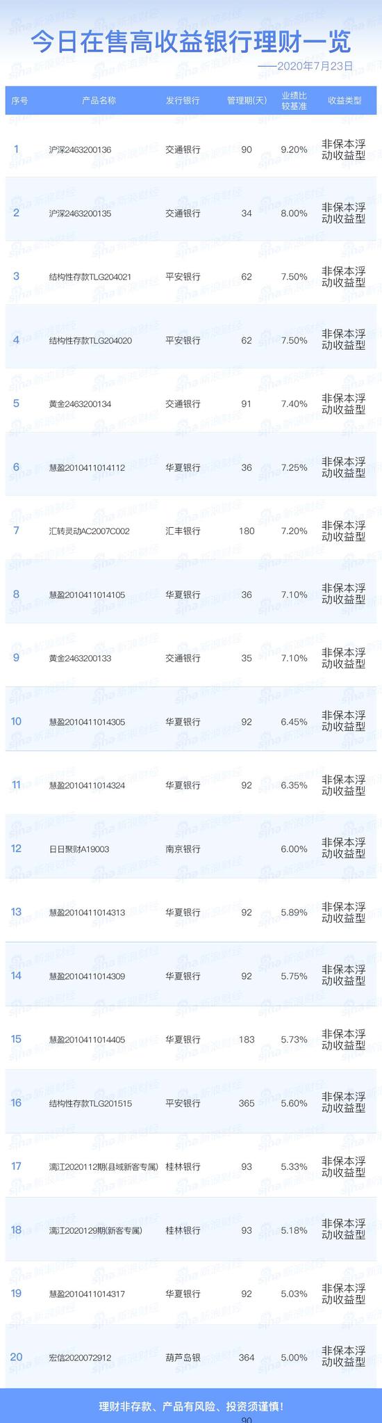 •   新浪财经消息   7月23日在售高收益银行理财产品:今日业绩比较基准在8.0%及以上的银行人民币理财产品共2款。交通银行的“沪深2463200136”业绩比较基准最高,为9.20%。