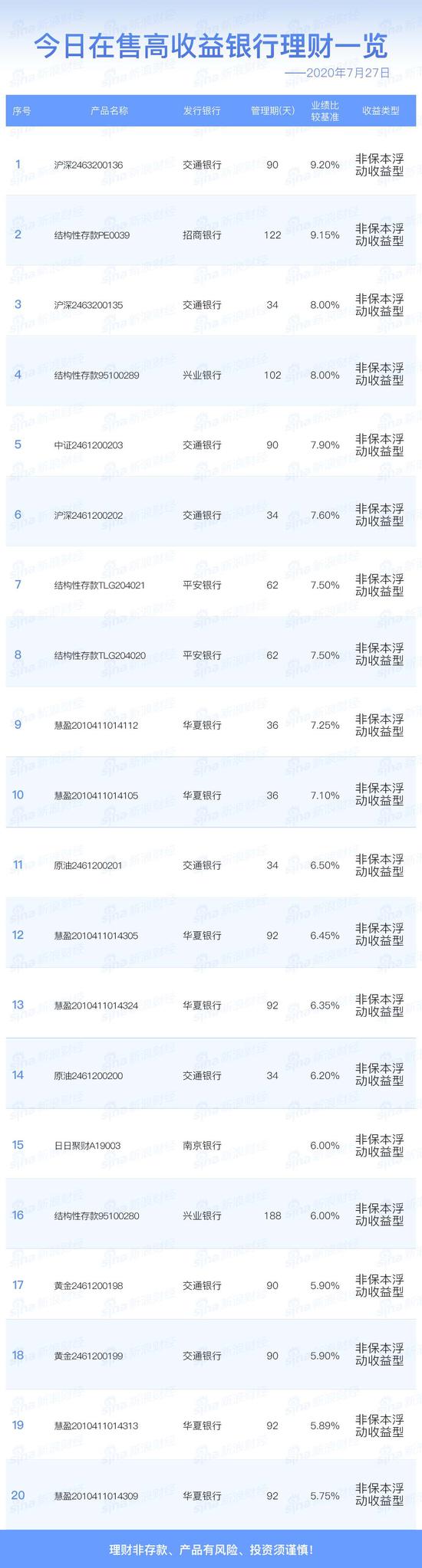 •   新浪财经消息   7月27日在售高收益银行理财产品:今日业绩比较基准在9.0%及以上的银行人民币理财产品共2款。交通银行的“沪深2463200136”业绩比较基准最高,为9.20%。