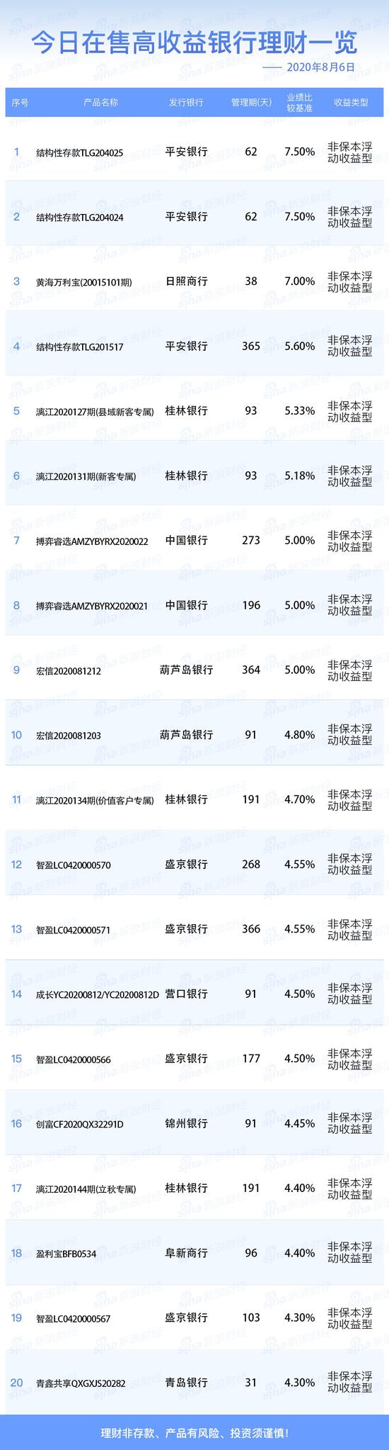 •   新浪财经8月6日在售高收益银行理财产品:今日业绩比较基准在7.00%及以上的银行人民币理财产品共3款。平安银行的“结构性存款TLG204025”和“结构性存款TLG204024”业绩比较基准最高,为7.50%。
