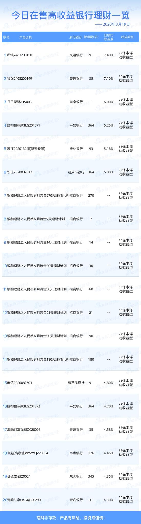 银行8月19日在售高收益理财产品