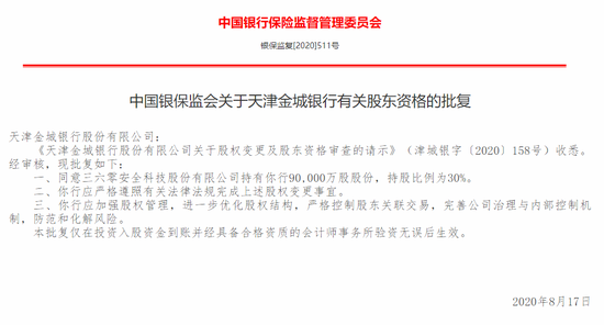 360入股天津金城银行获银保监会批准