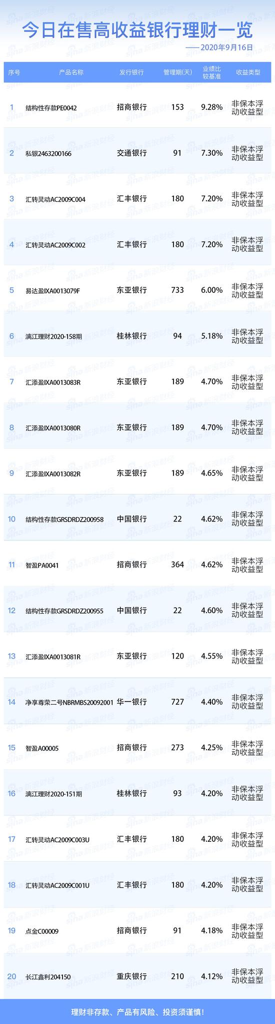 •   9月16日在售高收益银行理财产品:今日业绩比较基准在7.00%及以上的银行人民币理财产品共4款。招商银行的“结构性存款PE0042”业绩比较基准最高,为9.28%。