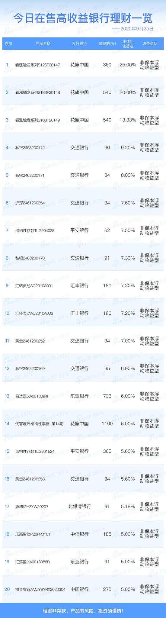 银行9月25日在售高收益理财产品