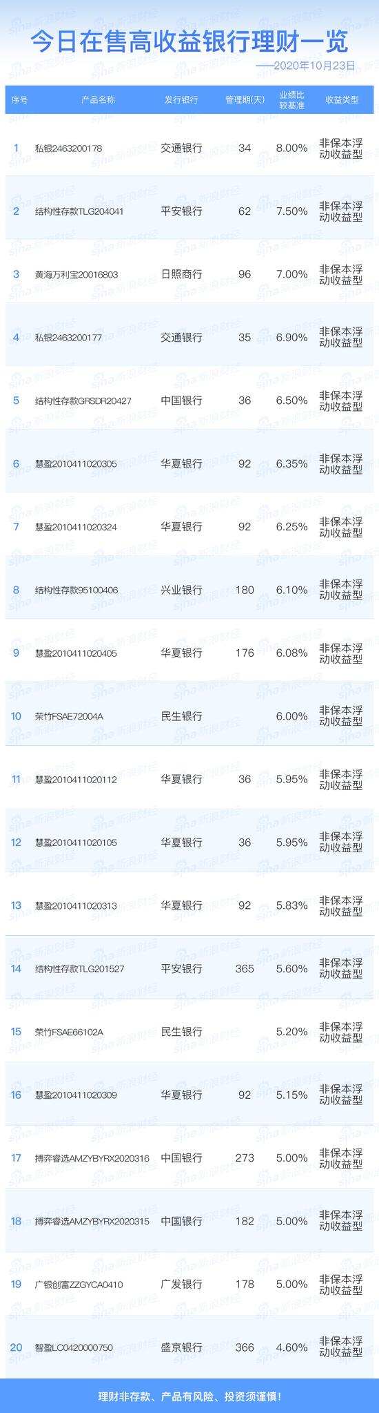 银行23日在售高收益理财产品一览
