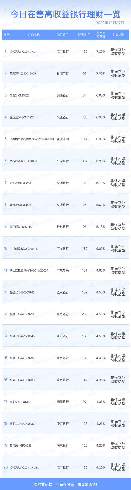 •   10月27日在售高收益银行理财产品:今日业绩比较基准在7.00%及以上的银行人民币理财产品共2款。汇丰银行的“汇转灵动AC2011A001”业绩比较基准最高,为7.20%。