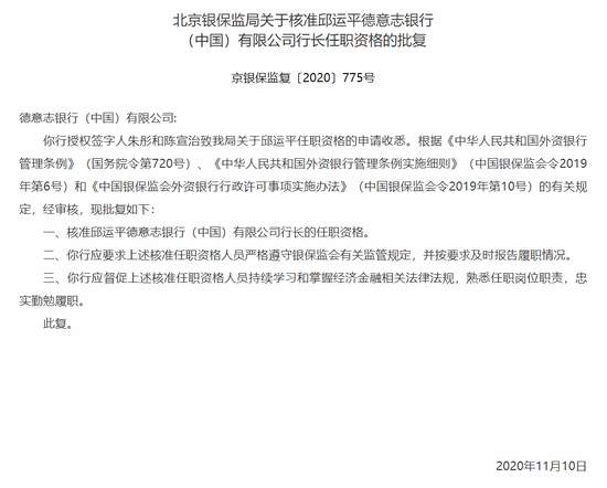 北京银保监局:核准邱运平担任德意志银行(中国)行长