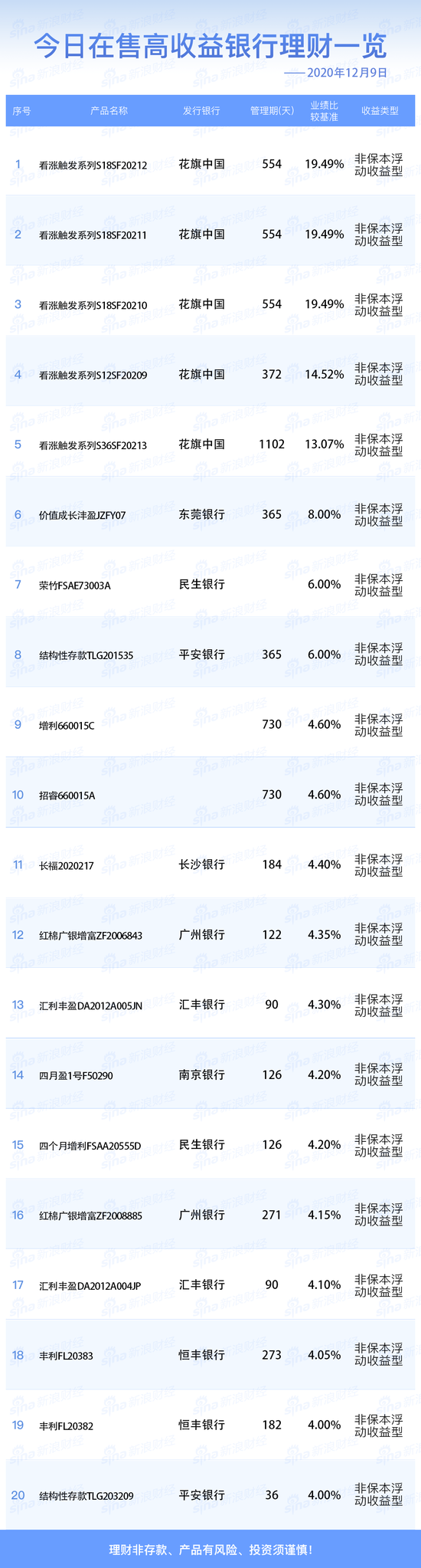 •   12月9日在售高收益银行理财产品:今日业绩比较基准在8%以上的银行人民币理财产品共6款。花旗中国“看涨触发系列S18SF20212”业绩比较基准最高,为19.49%。