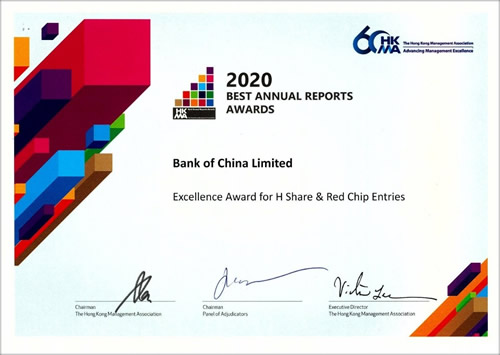 •         中国金融网讯   近期,在香港管理专业协会(HKMA)举办的最佳年度报告评比活动中,中国银行2019年年度报告荣获“最佳H股及红筹股奖项”,这是中行连续第三年获此奖项。中国银行是近年来唯一连续荣获此奖项的上市银行,体现了投资者对中行年度报告以及信息披露工作的认可与支持。