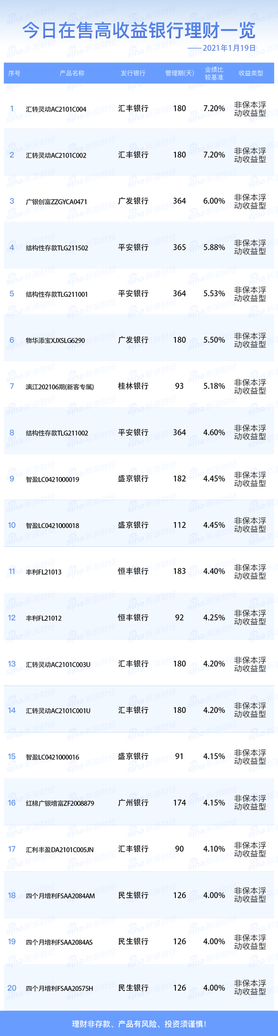 •   新浪财经1月19日在售高收益银行理财产品:今日业绩比较基准在6%以上的银行人民币理财产品共3款。汇丰银行“汇转灵动AC2101C004”业绩比较基准最高,为7.20%。