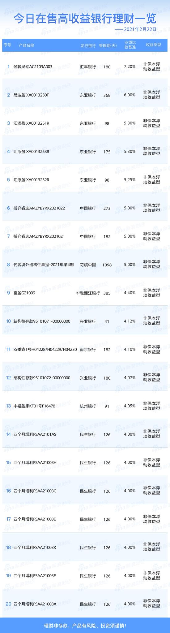 •   新浪财经2月22日在售高收益银行理财产品:今日业绩比较基准在5%以上的银行人民币理财产品共8款。汇丰银行“盈转灵动AC2103A003”业绩比较基准最高,为7.20%。