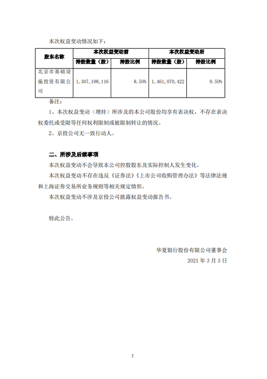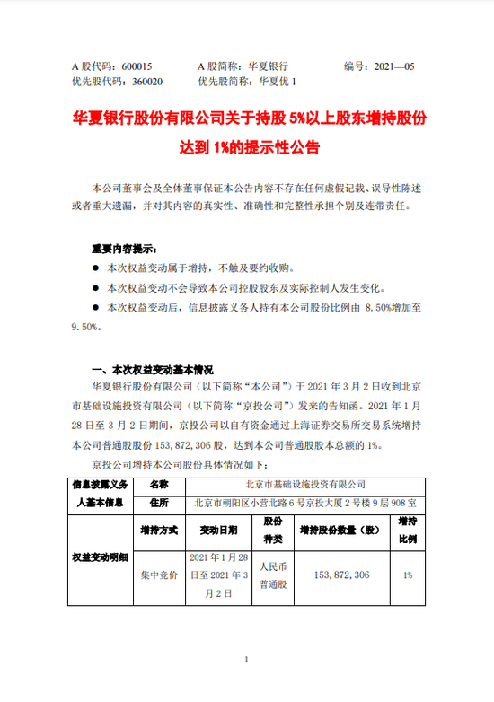 •   新浪财经3月2日消息,华夏银行发布公告,1月28日至3月2日期间,北京市基础设施投资有限公司(简称“京投公司”)以自有资金通过上交所交易系统增持公司普通股股份1.54亿股,达到公司普通股股本总额的1%。增持后,京投公司持股9.5%。