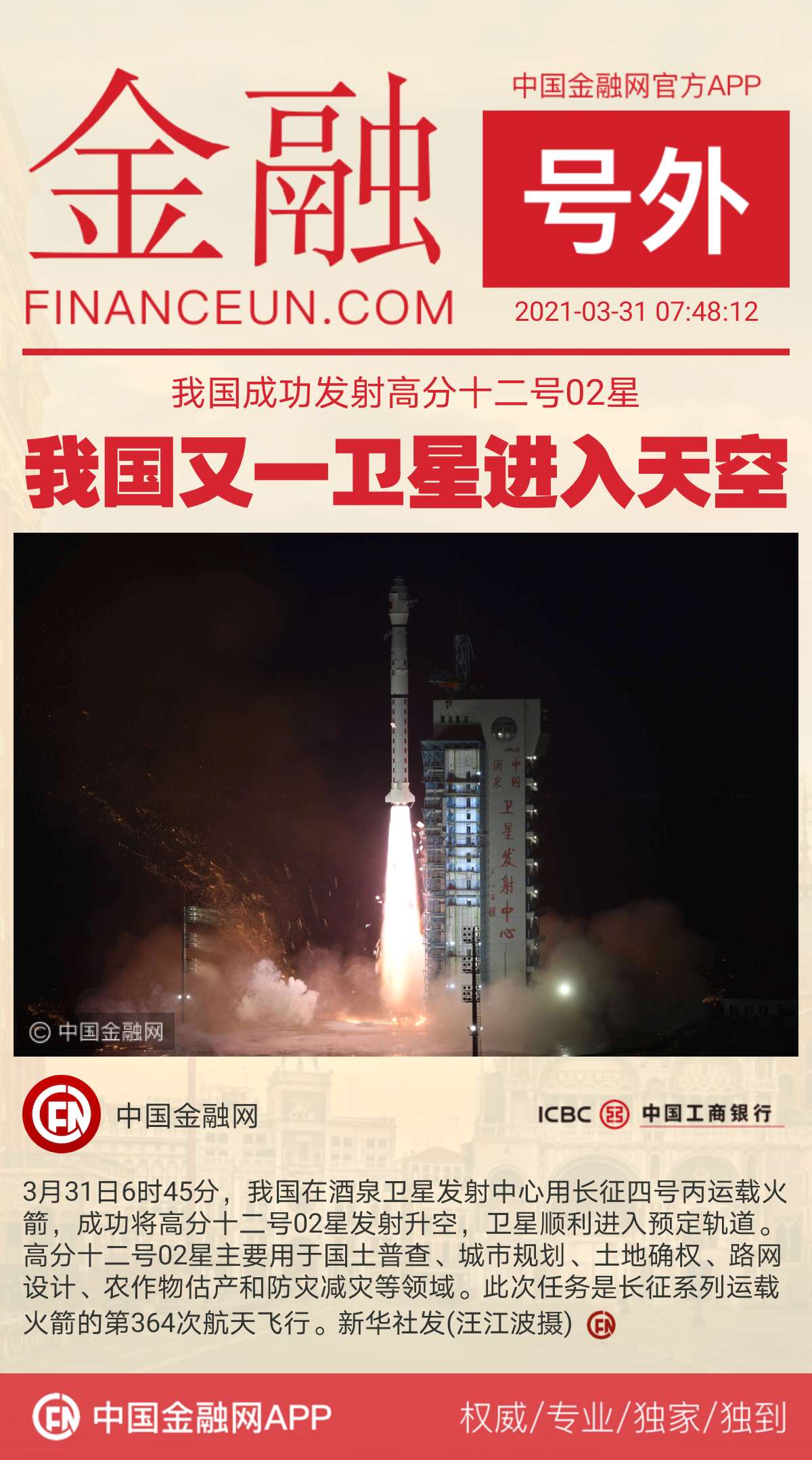 3月31日6时45分,我国在酒泉卫星发射中心用长征四号丙运载火箭,成功将高分十二号02星发射升空,卫星顺利进入预定轨道。高分十二号02星主要用于国土普查、城市规划、土地确权、路网设计、农作物估产和防灾减灾等领域。此次任务是长征系列运载火箭的第364次航天飞行。