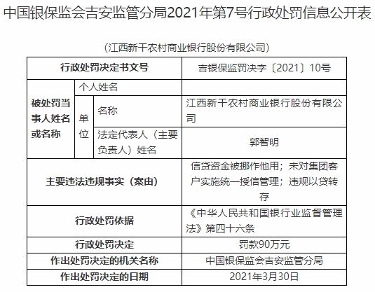 江西新干农商行3宗违法遭罚90万 信贷资金被挪用