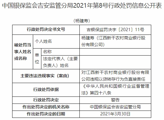 杨建寿对江西新干农村商业银行股份有限公司违规以贷转存行为负直接责任,依据《中华人民共和国银行业监督管理法》第四十八条,中国银保监会吉安监管分局对其警告。