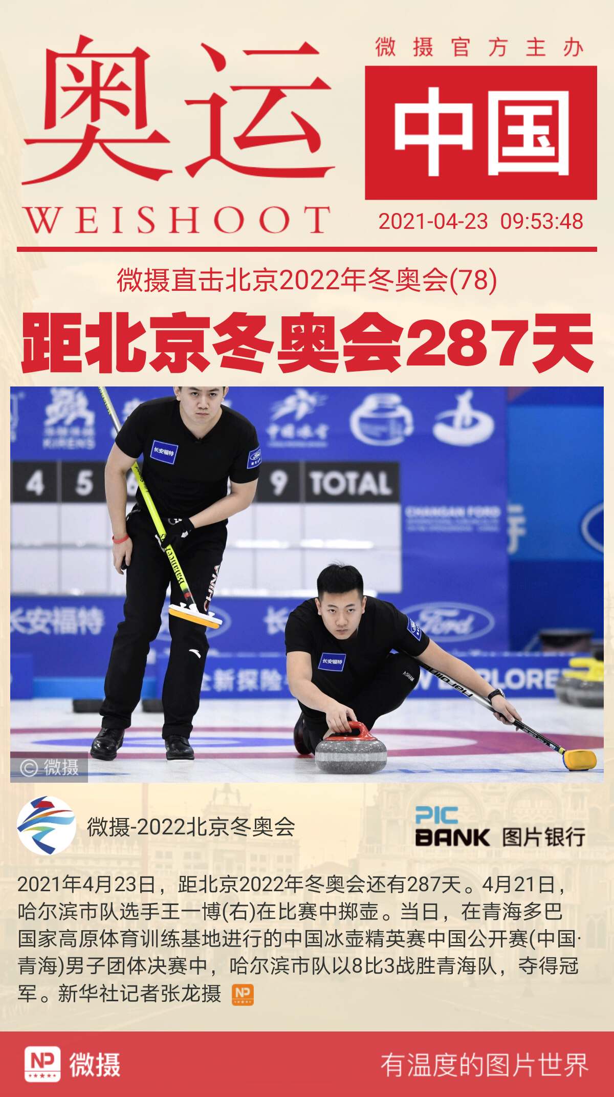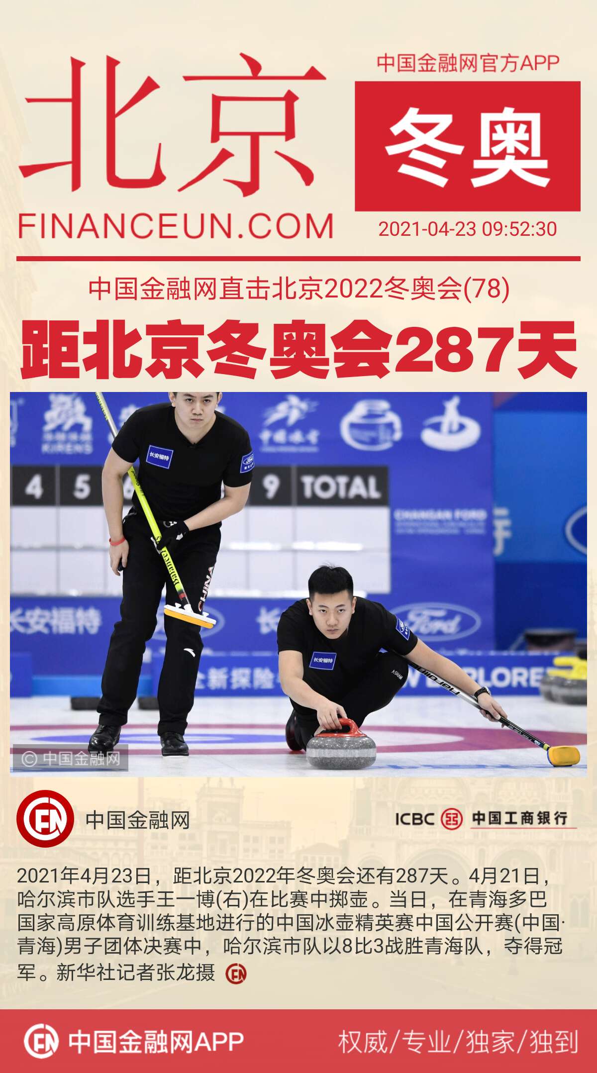 2021年4月23日,距北京2022年冬奥会还有287天。4月21日,哈尔滨市队选手王一博(右)在比赛中掷壶。当日,在青海多巴国家高原体育训练基地进行的中国冰壶精英赛中国公开赛(中国·青海)男子团体决赛中,哈尔滨市队以8比3战胜青海队,夺得冠军。