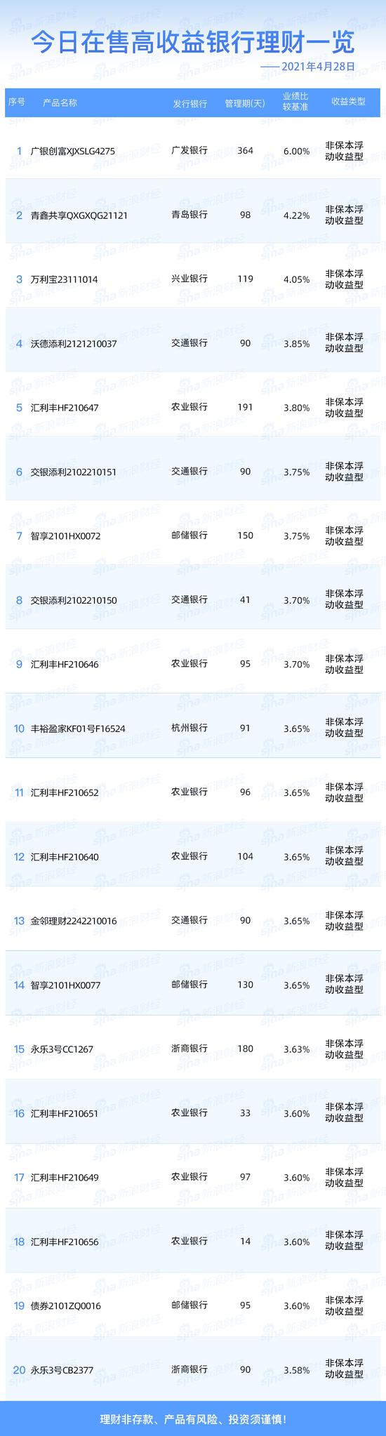 •   新浪财经4月28日在售高收益银行理财产品:今日业绩比较基准在4%以上的银行人民币理财产品共4款。广发银行“广银创富XJXSLG4275”业绩比较基准最高,为6%。