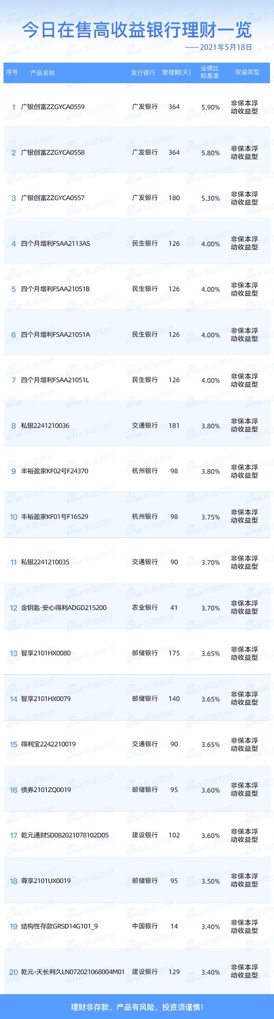 •   新浪财经5月18日在售高收益银行理财产品:今日业绩比较基准在4%以上的银行人民币理财产品共7款。广发银行“广银创富ZZGYCA0559”业绩比较基准最高,为5.9%。