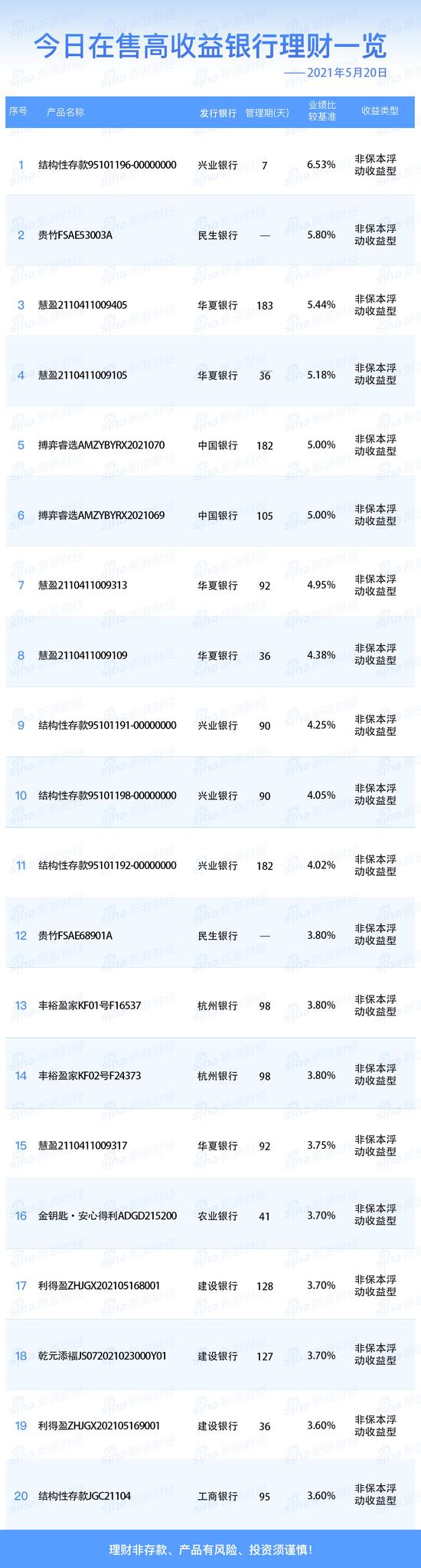 •   新浪财经5月19日在售高收益银行理财产品:今日业绩比较基准在5%以上的银行人民币理财产品共6款。兴业银行“结构性存款95101196-00000000”业绩比较基准最高,为6.53%。