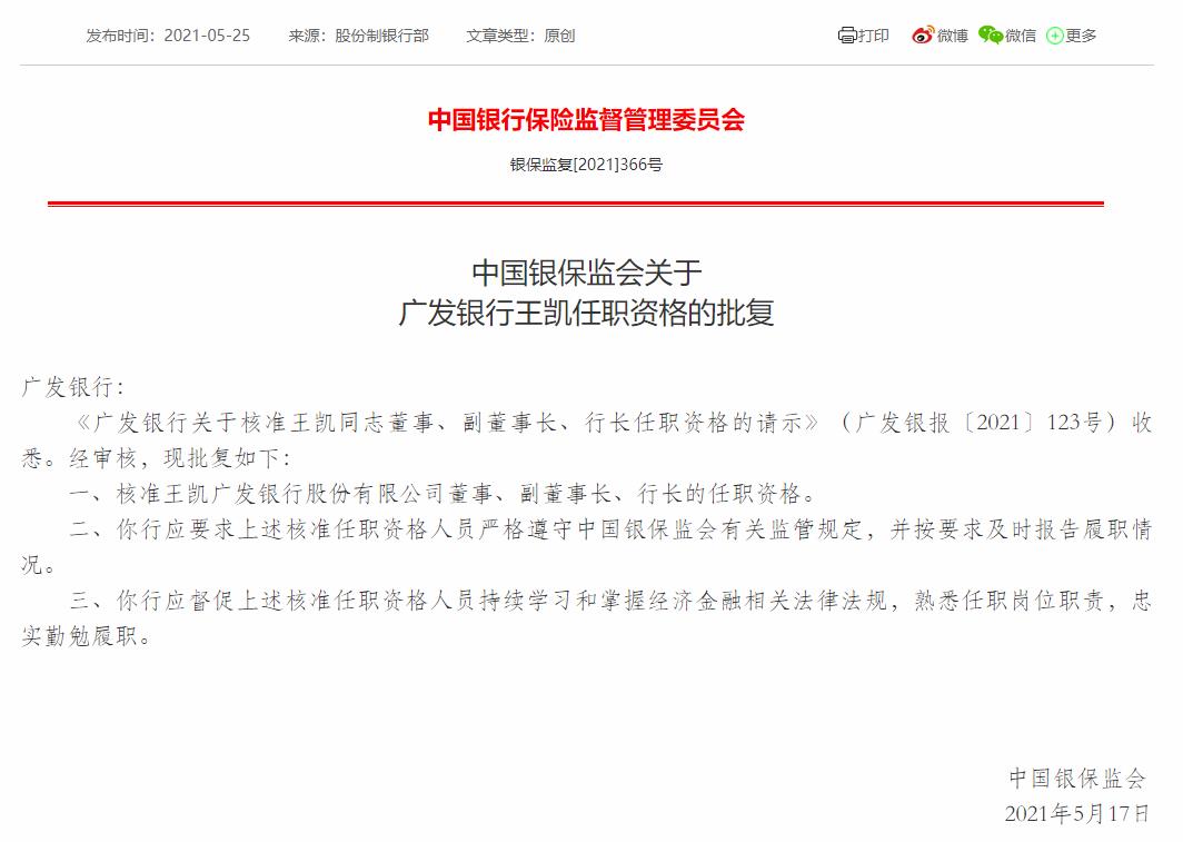 银保监会核准王凯广发银行副董事长、行长任职资格