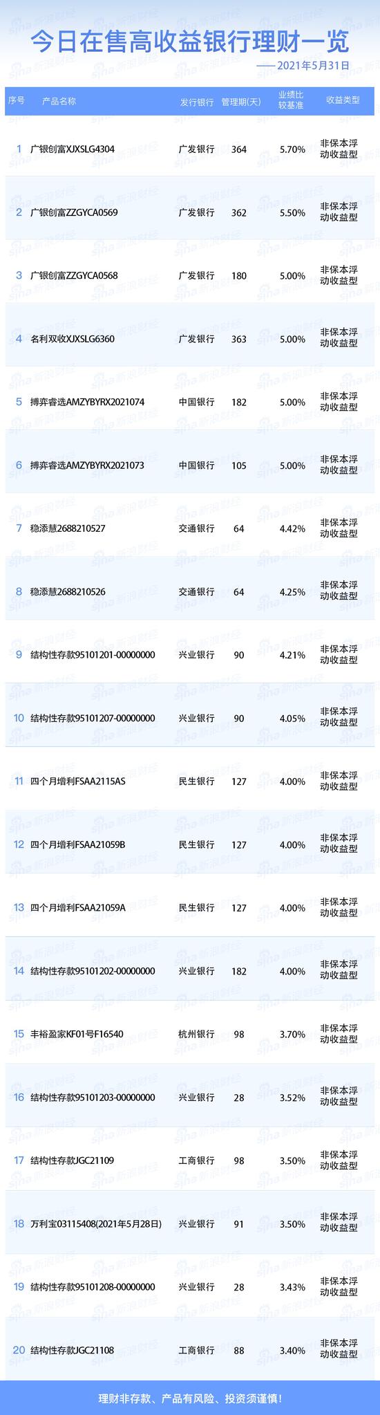 •   新浪财经5月31日在售高收益银行理财产品:今日业绩比较基准在5%以上的银行人民币理财产品共6款。广发银行的“广银创富XJXSLG4304”业绩比较基准最高,为5.7%。