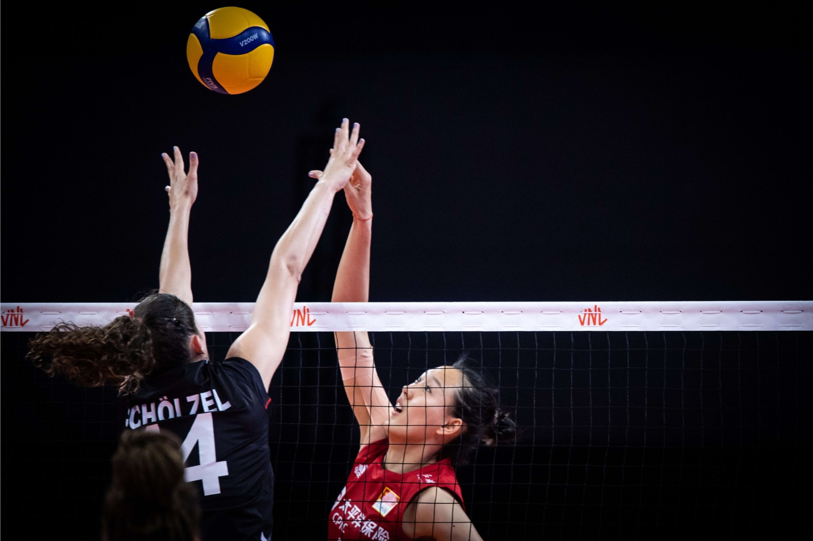 5月31日,中国队球员杨涵玉(右)在比赛中进攻。