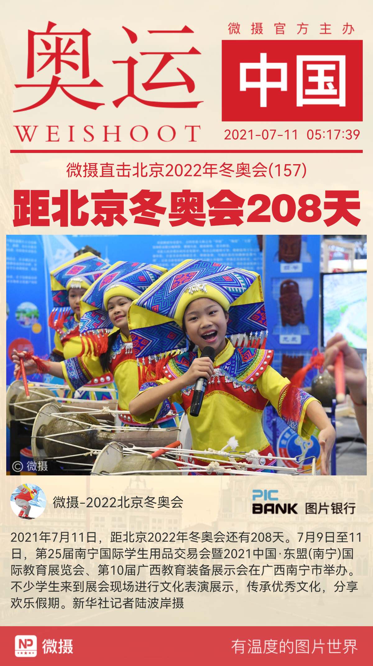2021年7月11日,距北京2022年冬奥会还有208天。7月9日至11日,第25届南宁国际学生用品交易会暨2021中国·东盟(南宁)国际教育展览会、第10届广西教育装备展示会在广西南宁市举办。不少学生来到展会现场进行文化表演展示,传承优秀文化,分享欢乐假期。