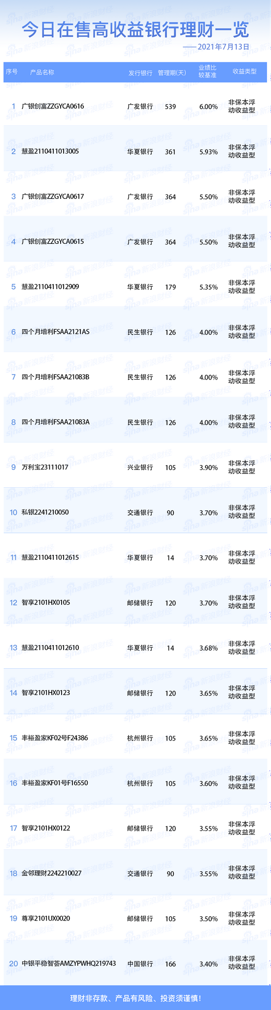 •   新浪财经7月13日在售高收益银行理财产品:今日业绩比较基准在5.50%以上的银行人民币理财产品共4款。广发银行的“广银创富ZZGYCA0616”、华夏银行的“慧盈2110411013005”业绩比较基准最高,为6.00和5.93%%。