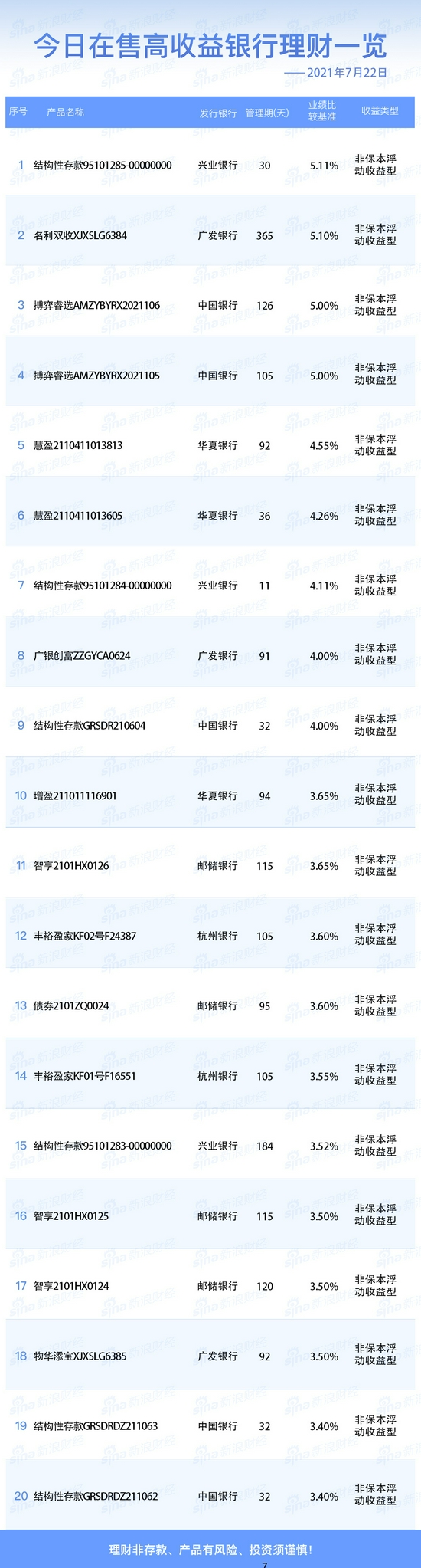 •   新浪财经7月22日在售高收益银行理财产品:今日业绩比较基准在3.65%以上的银行人民币理财产品共9款。兴业银行的“结构性存款95101285-00000000”业绩比较基准最高,为5.11%。