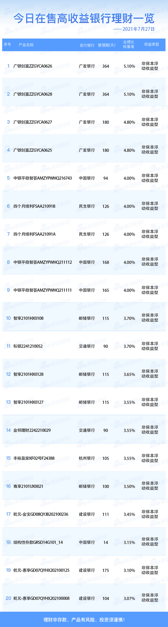 •   新浪财经7月27日在售高收益银行理财产品:今日业绩比较基准在4.00%以上的银行人民币理财产品共9款。广发银行的“广银创富ZZGYCA0626”业绩比较基准最高,为5.11%。