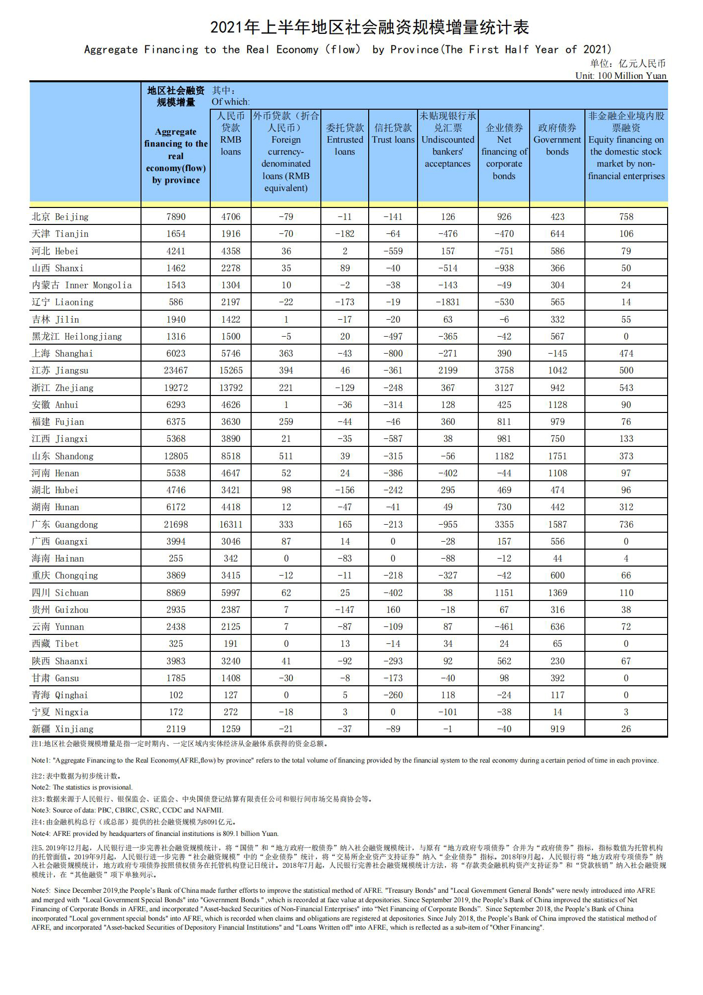 •        中国金融网讯  央行今日发布2021年上半年地区社会融资规模增量统计表。
