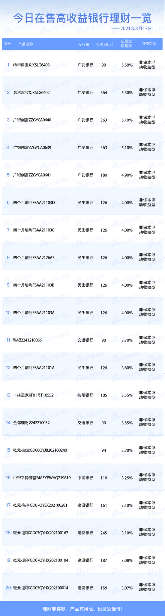 •   新浪财经8月17日在售高收益银行理财产品:今日业绩比较基准在5%以上的银行人民币理财产品共4款。广发银行的“物华添宝XJXSLG6403”业绩比较基准最高,为5.50%。