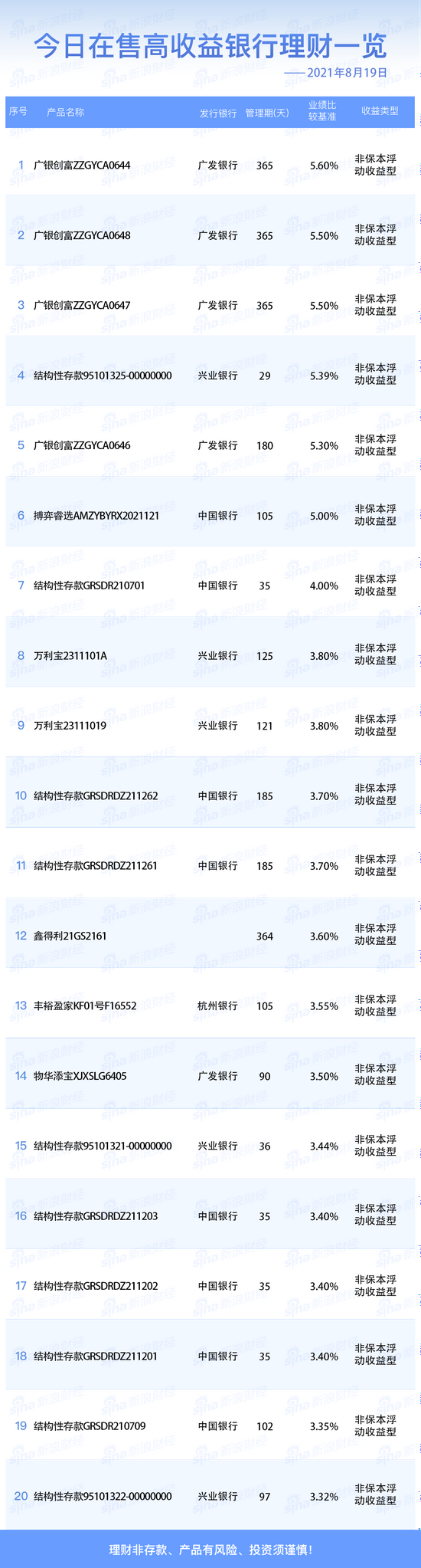 •   新浪财经8月19日在售高收益银行理财产品:今日业绩比较基准在5.00%以上的银行人民币理财产品共6款。广发银行的“广银创富ZZGYCA0644”业绩比较基准最高,为5.60%。