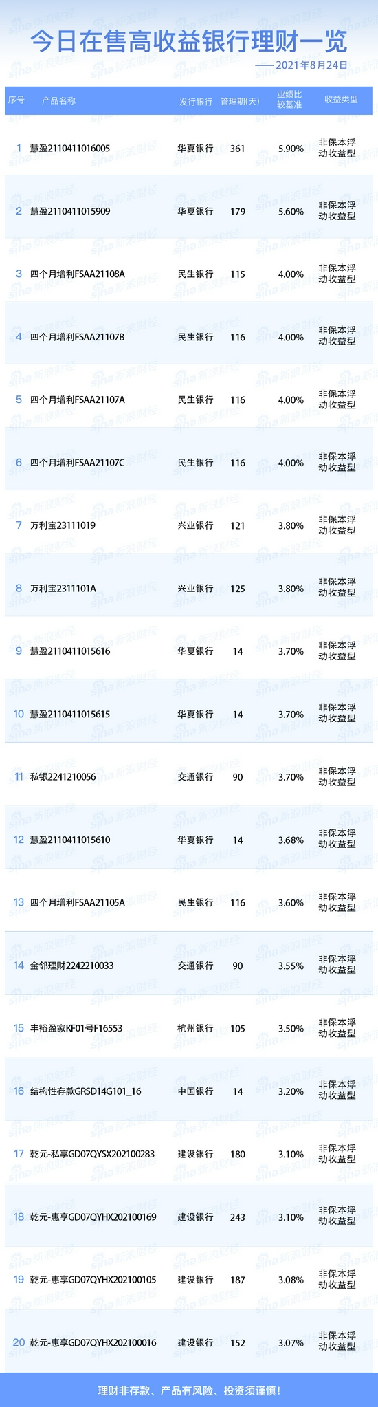 新浪财经8月24日在售高收益银行理财产品:今日业绩比较基准在3.90%以上的银行人民币理财产品共6款。华夏银行的“慧盈2110411016005”业绩比较基准最高,为5.90%。