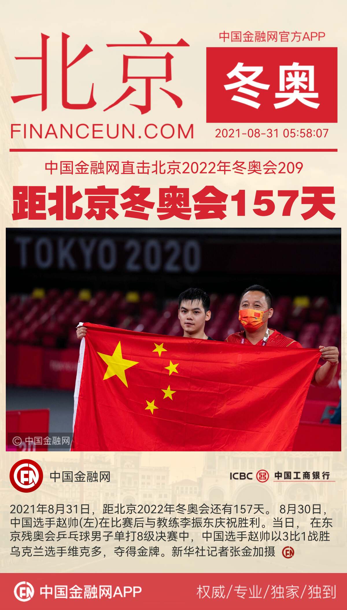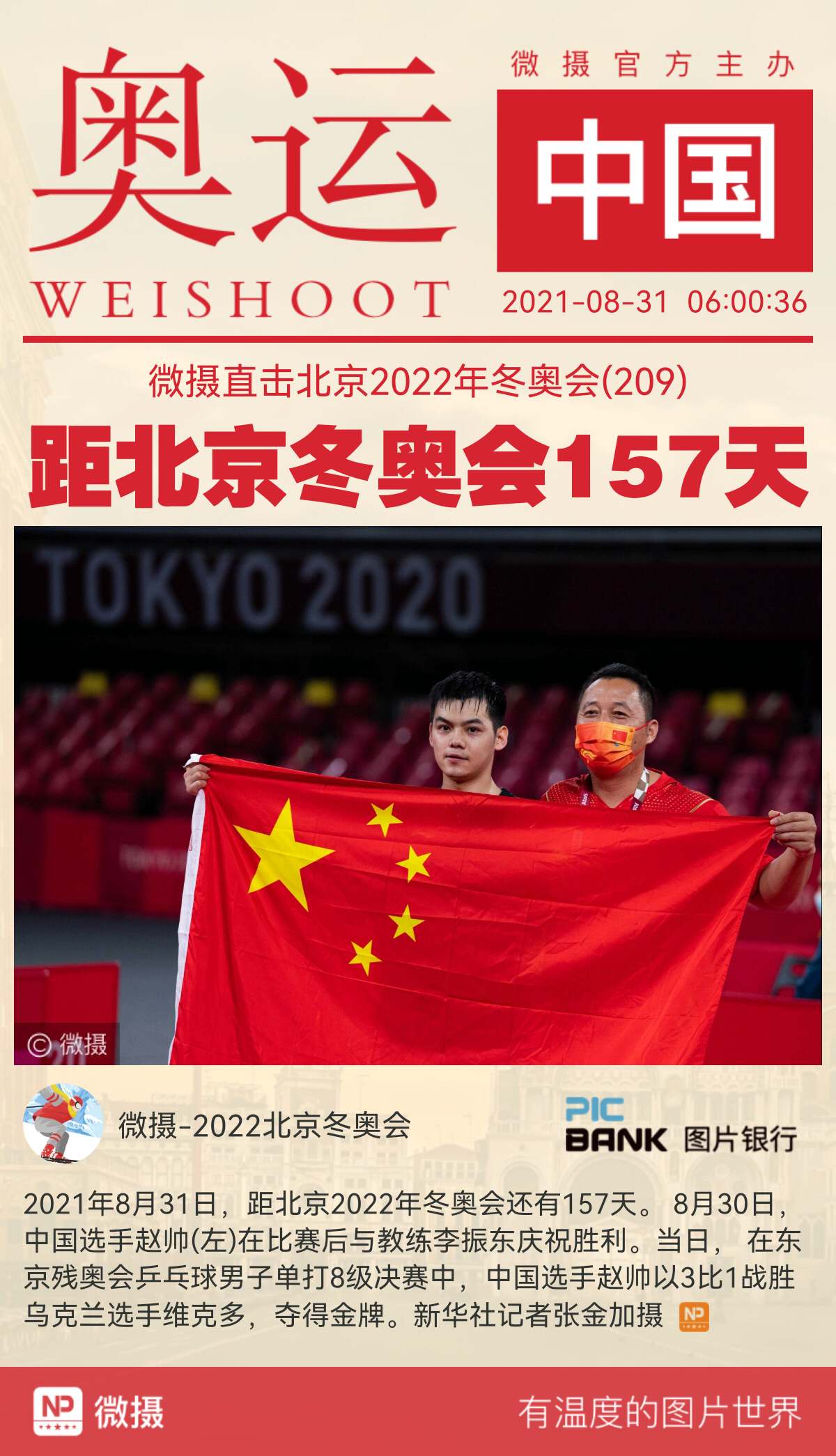 2021年8月31日,距北京2022年冬奥会还有157天。 8月30日,中国选手赵帅(左)在比赛后与教练李振东庆祝胜利。当日, 在东京残奥会乒乓球男子单打8级决赛中,中国选手赵帅以3比1战胜乌克兰选手维克多,夺得金牌。