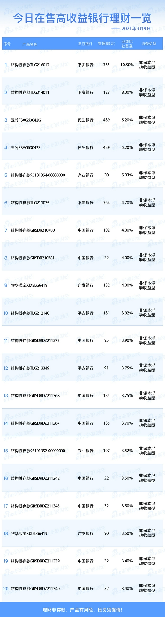 •   新浪财经9月9日在售高收益银行理财产品:今日业绩比较基准在5%以上的银行人民币理财产品共5款。平安银行的“结构性存款TLG216017”业绩比较基准最高,为10.5%。
