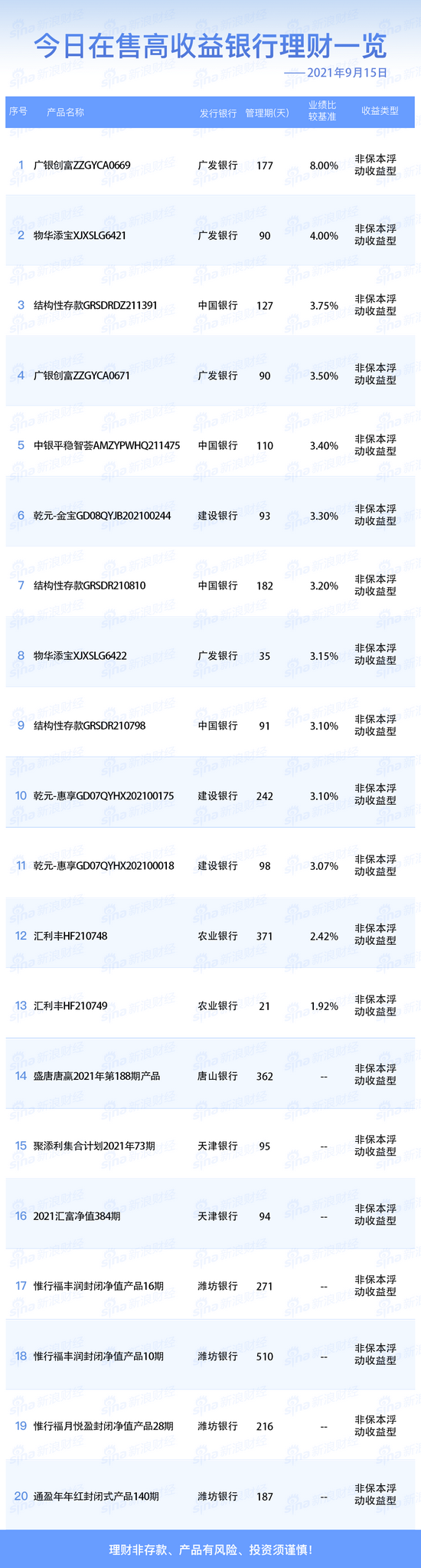 银行9月15日在售高收益理财产品