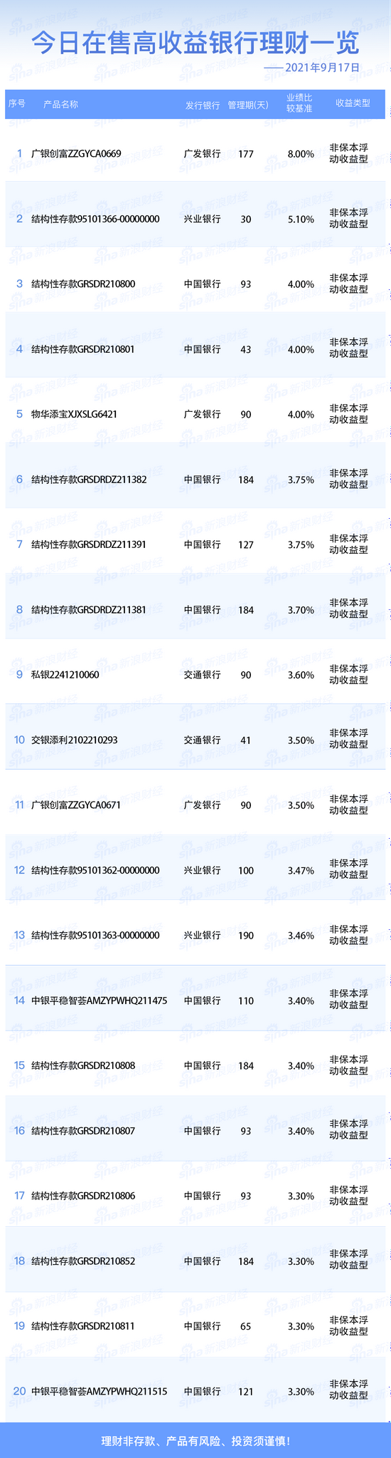 银行9月17日在售高收益理财产品