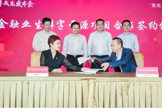 北京金融科技产业联盟秘书长潘润红、中信银行信息技术管理部总经理寇冠共同签署“金融业生僻字开源项目合作协议”。
