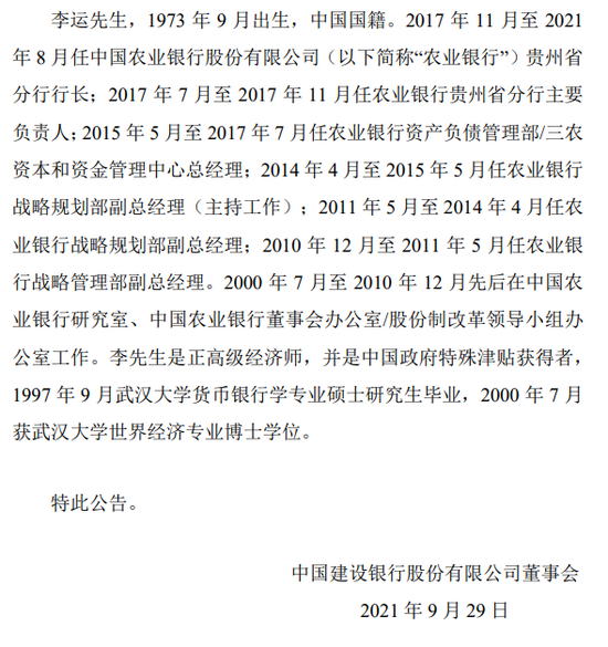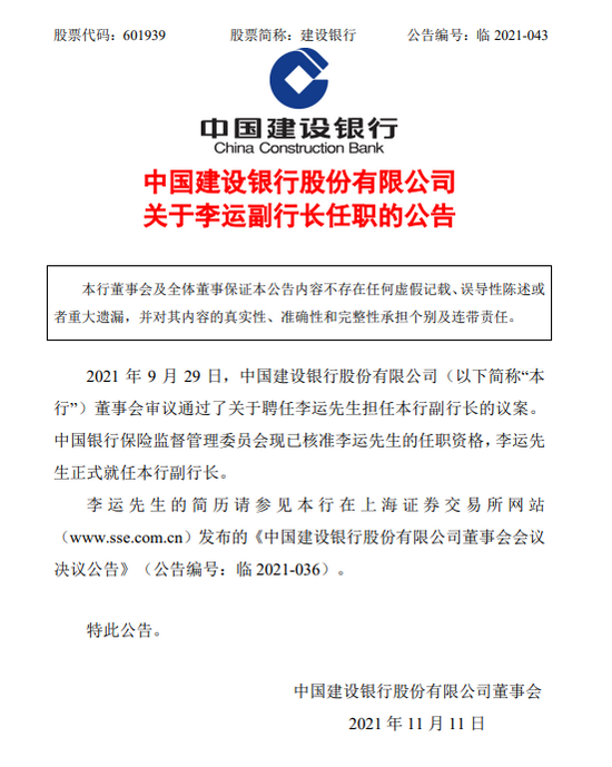 •   新浪财经11月11日消息,建设银行公告,银保监会现已核准李运的任职资格,李运正式就任本行副行长。